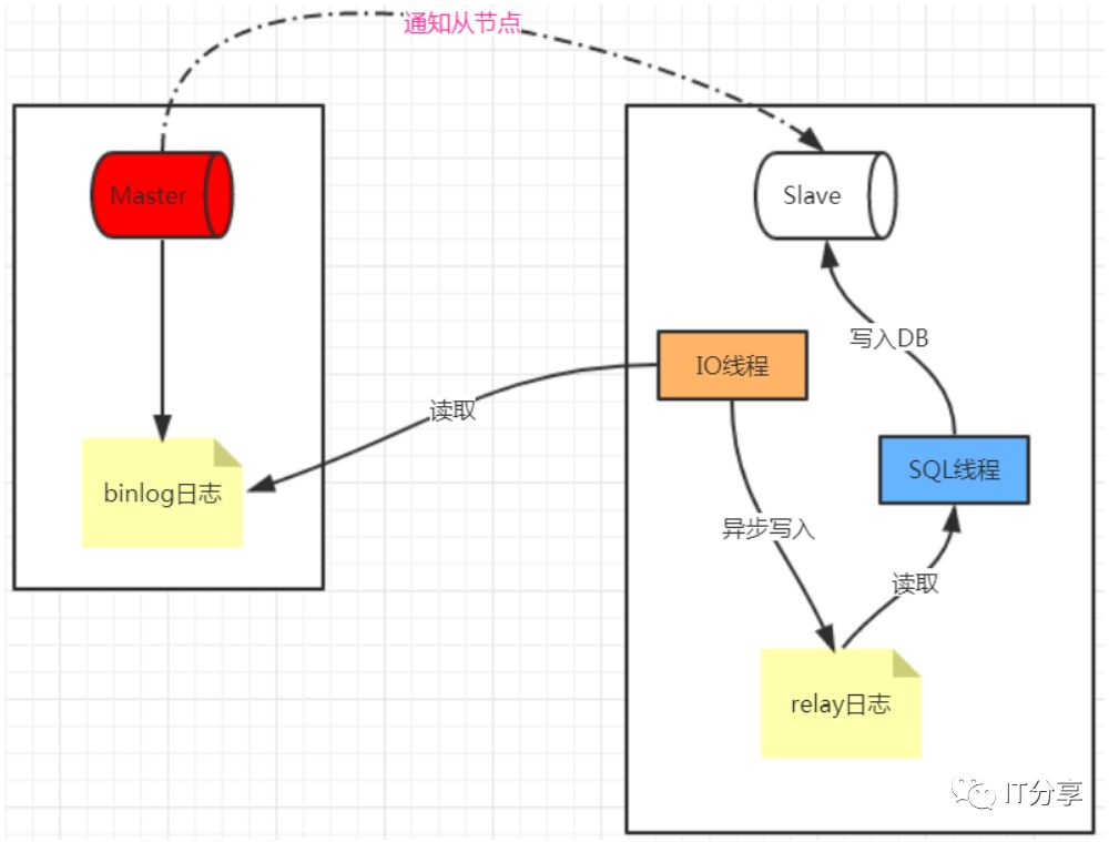 总结:只要对于数据库的操作,命令都会写到binlog日志里面去,包含授权,然后由master去异步的通知所有的slave节点,然后salve节点开启IO线程按照master给的账号去读取binlog日志里的信息。然后按照指定的格式写入到rely二进制文件中,然后SQL线程去读取中转日志rely,把数据全部写入到数据库。完成对master和salve的同步。