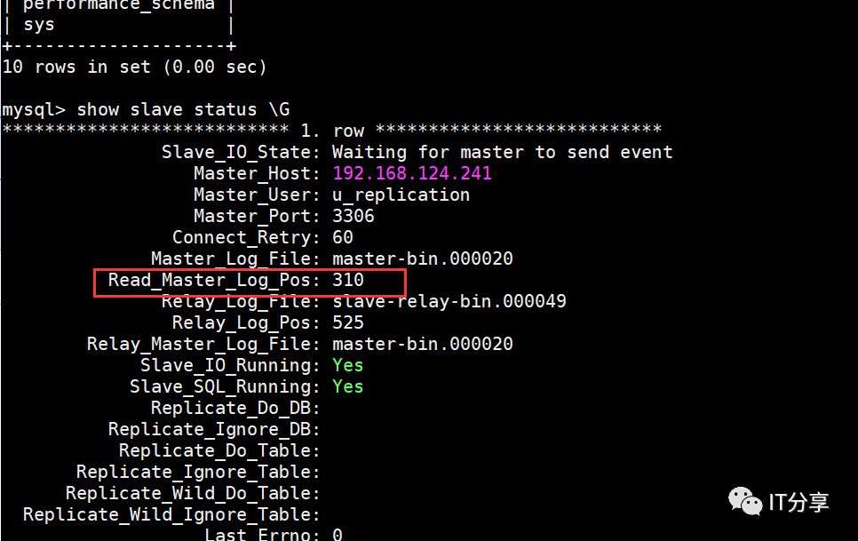 master_host:主机ip master_port:同步的master库端口号 master_user master:提供于slave同步数据用户名 master_password 提供于slave同步数据密码 master_log_file master对应 binlog文件名称 master_log_pos masterbinlog文件最终的位置(内容的偏移量)[slave同步master开始位置]