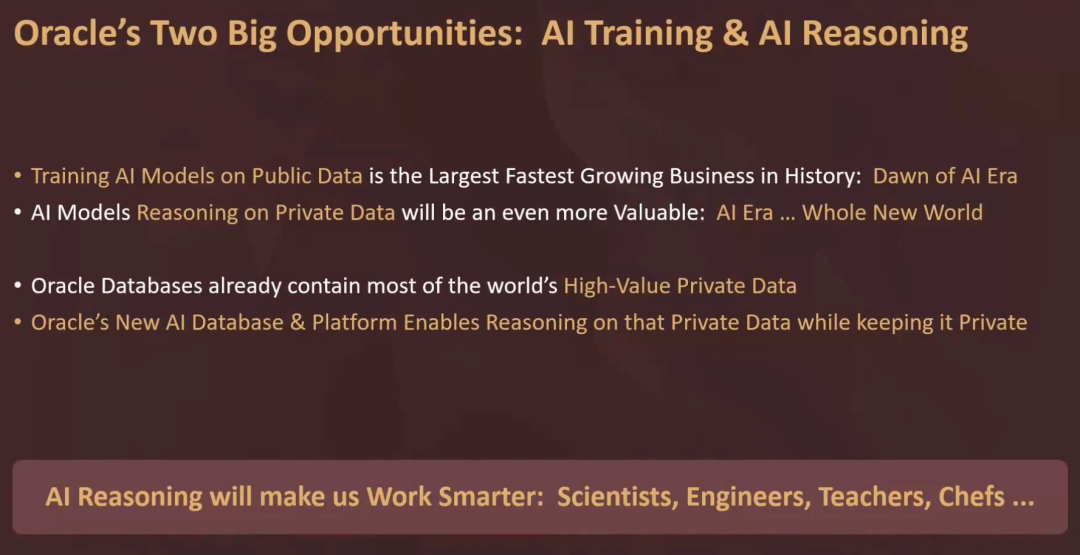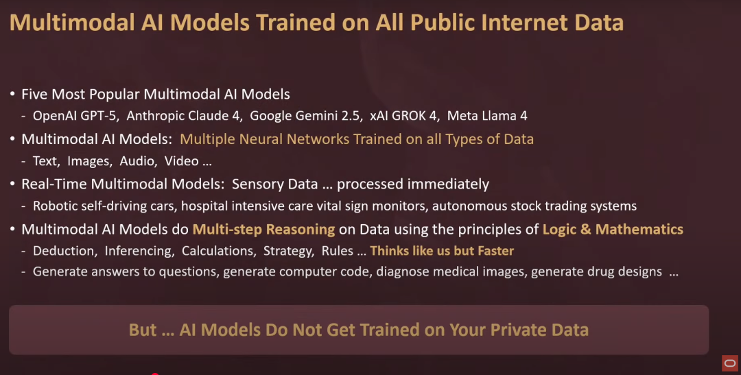 Oracle的数据中心训练和很多世界领先的模型,这些模型聚焦在公共的互联网数据上。现在Oracle通过AI数据库能够更好地补齐私有数据了。