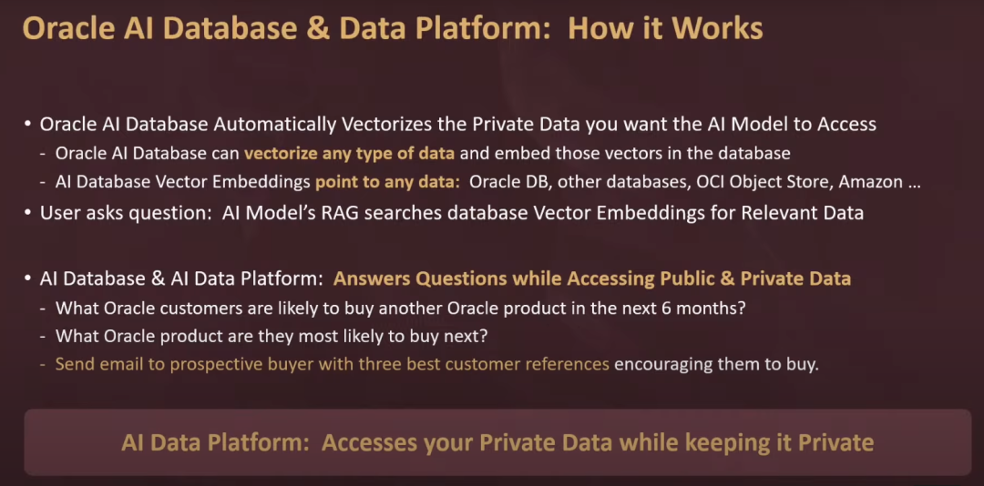 当用户提出问题时,AI 模型的 RAG 会通过数据库中的向量嵌入寻找相关数据。Oracle AI 数据库与 AI 数据平台可以实现在访问公共数据和私有数据的同时回答问题,并且保持自有数据的私密性。