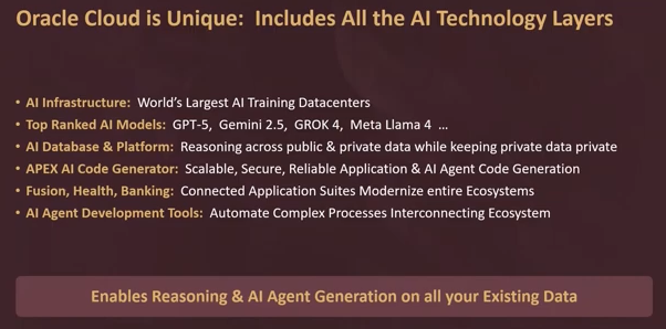 Oracle Cloud是独特的,因其包含了AI技术的所有层级。从AI基础设施到AI代理开发工具。Oracle在AI时代打了一场翻身仗。