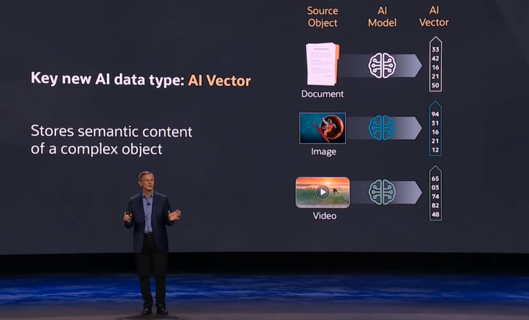 关于Oracle AI Database的核心演进,Oracle数据库的新掌门人Juan Loaiza在他的主题演讲中进行了充分的展开,新的AI数据类型:AI Vector 是核心特性。这值得用另外一个主题进行专门展开了。