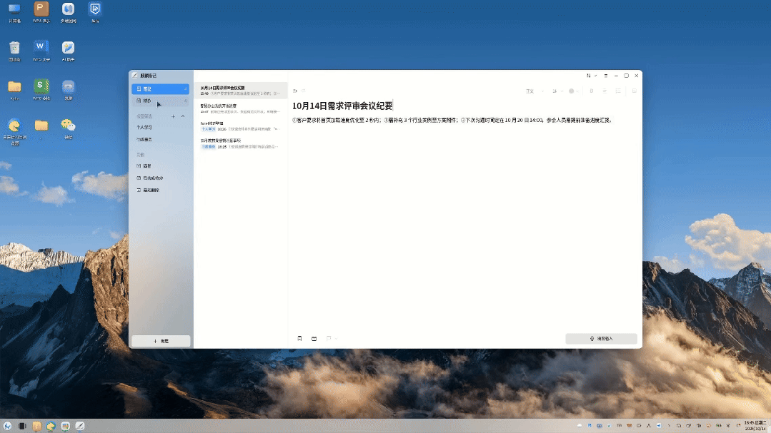 单击桌面任务栏图标呼出麒麟速记快捷视图列表,扫一眼就能快速掌握近期待办,让日程规划更高效!