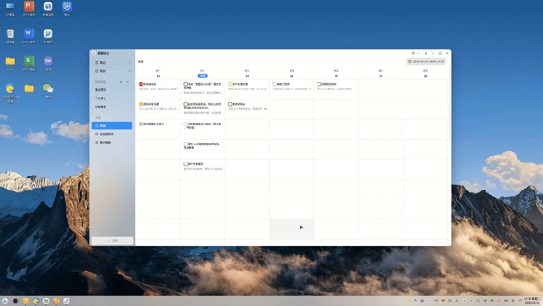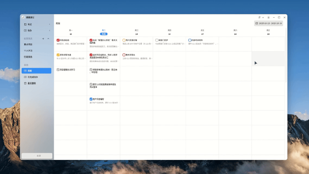 点击麒麟速记主页面侧边栏进入周报视图,可以浏览整周待办,避免遗漏关键事务: