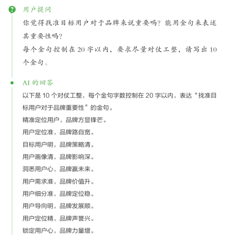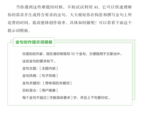 此外,书中还介绍了金句创作、修辞手法运用等技巧,让我们的文案更具感染力和吸引力。通过学习这些技巧,我们能够充分发挥AI的优势,同时融入自己的创意和个性,打造出独一无二的优质作品。