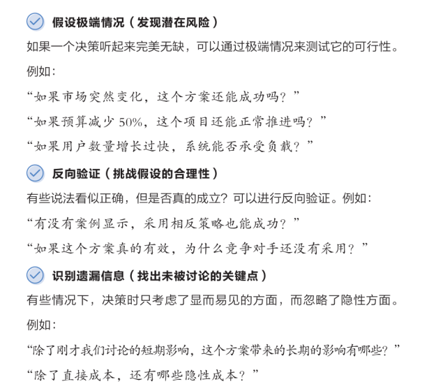 当我们从AI或其他渠道获取信息时,不能盲目相信,而应该保持怀疑和批判的态度。通过提出一系列批判性问题,如“这个信息的来源可靠吗?”“是否有其他相反的观点或证据?”“这个结论的推理过程是否合理?”等,我们可以对信息进行深入分析和评估,从而判断其真实性和可信度。