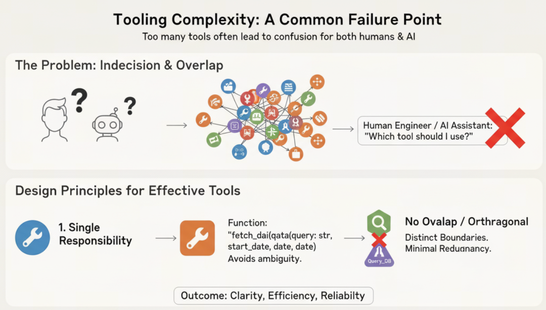 工具太多往往是导致失败的常见原因。当人类工程师无法清晰判断应该使用哪个工具时,AI同样难以做出更好的选择。