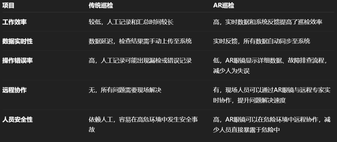 AR巡检则通过增强现实技术的加持,极大地优化了巡检流程。AR技术通过分体式AR眼镜,为巡检员提供实时、直观的信息展示和远程专家协助,让工作变得更加高效和精准。