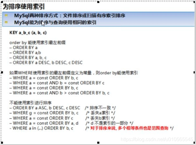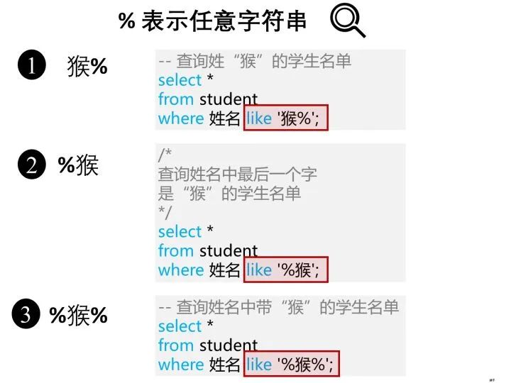 (oracle,SQL server中出现在select 子句后的非分组函数,必须出现在group by子句后出现),MySQL中可以不用having 对分组结果指定条件,如: [大于60分]order by 对查询结果排序,如: [增序: 成绩 ASC / 降序: 成绩 DESC]