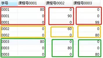 max(case 课程号 when '0003' then 成绩 else 0 end) as '课程号0003'