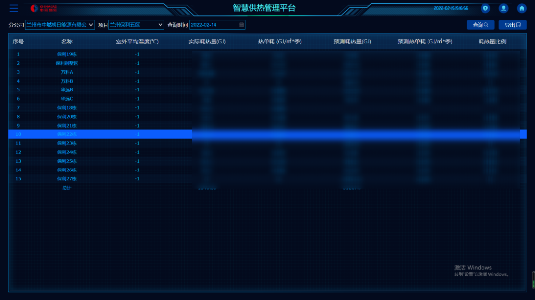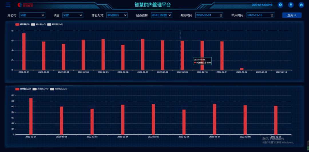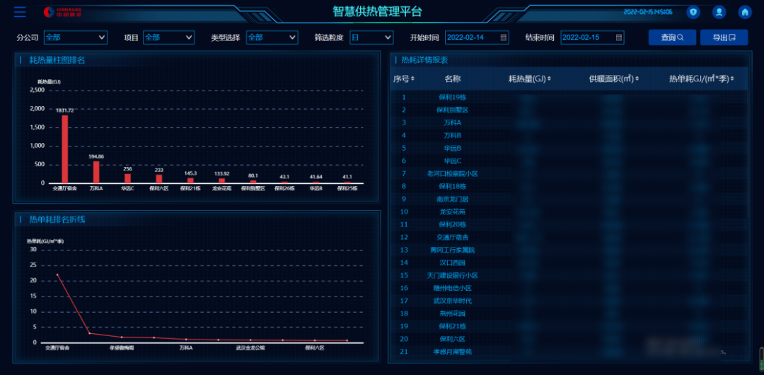 驾驶舱整合供暖季能耗、12小时实时能耗、用户室温占比、室外温度等关键信息,以可视化图表呈现。在驾驶舱界面中可直观查看各站点耗热量、供水温度等数据,快速定位高能耗站点,为决策提供依据。