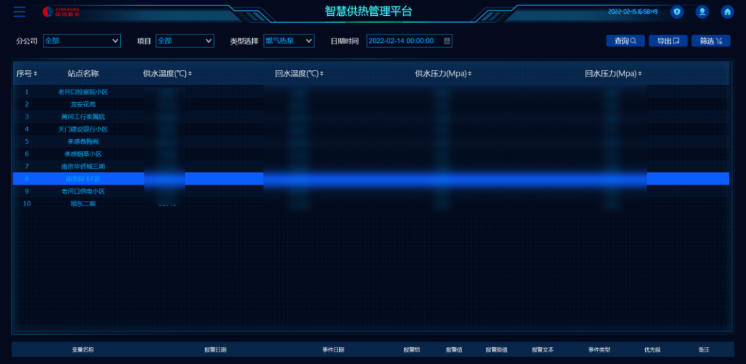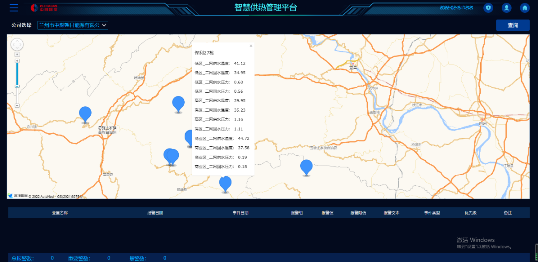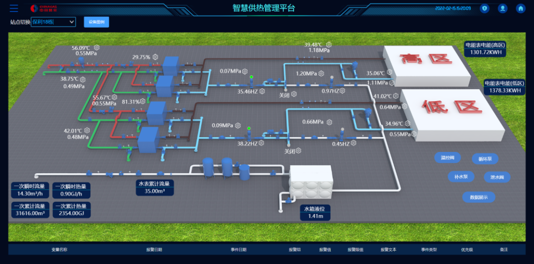 工艺流程监控支持仿真工艺与实时数据结合,展示换热站循环泵、补水泵等设备运行状态;报警管理功能可以实时分类展示压力、温度异常报警,支持历史查询与限值配置,保障系统安全;GIS定位功能支持在地图标注站点位置,点击查看详细参数,解决传统“纸质台账”管理难题。