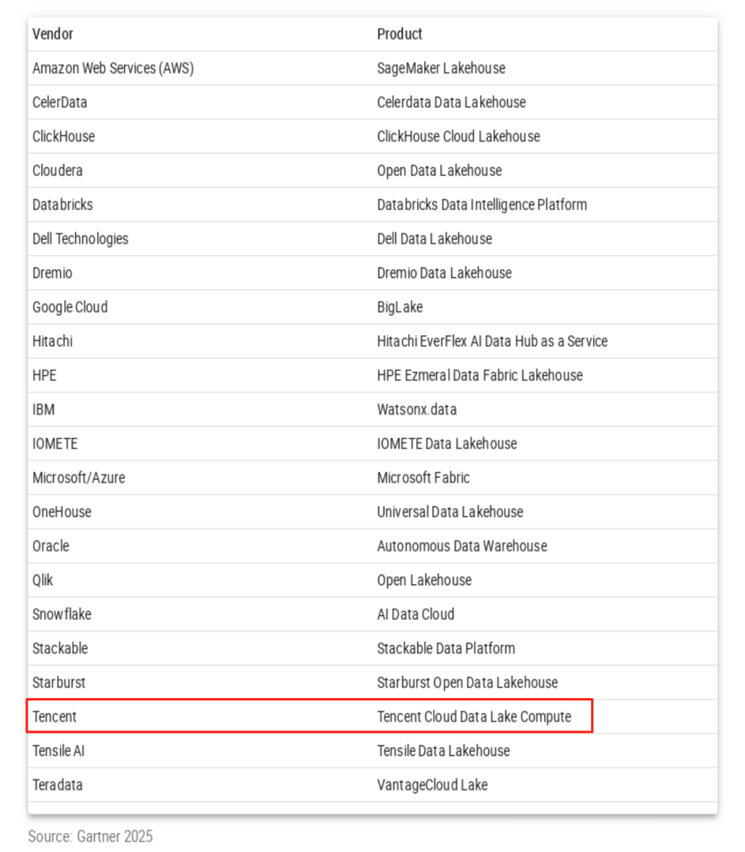 在这样的背景下,全球湖仓市场进入加速融合与竞争阶段。本次Gartner共选出22家具有代表性的厂商,涵盖传统数据仓库厂商(如AWS、Google、Snowflake)、数据湖厂商(如Databricks、Cloudera)以及查询加速器厂商等多种类型。腾讯云DLC能够在这22家全球领先厂商中入选,展现了中国厂商在开放标准、计算性能和智能融合等方面的持续突破。