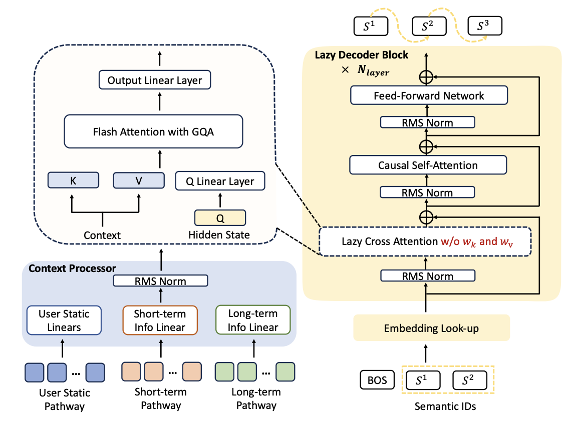 需要注意的是OneRec V2模型架构换称“Lazy Decoder-Only”,在笔者看来仍然是Encoder-Decoder结构,只是Encoder部分去掉了双向Attention变简单了,用户行为序列还需要与CrossAttention结合,这个是与LLM Decoder-Only最关键的区别。