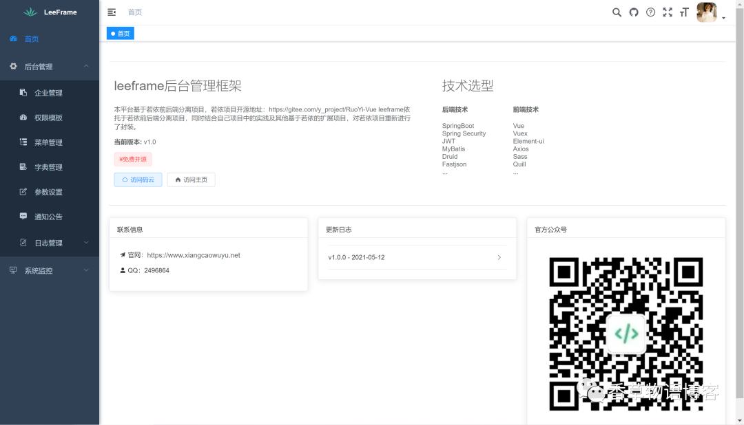 本平台基于若依前后端分离项目,若依项目开源地址:https://gitee.com/y_project/RuoYi-Vue leeframe