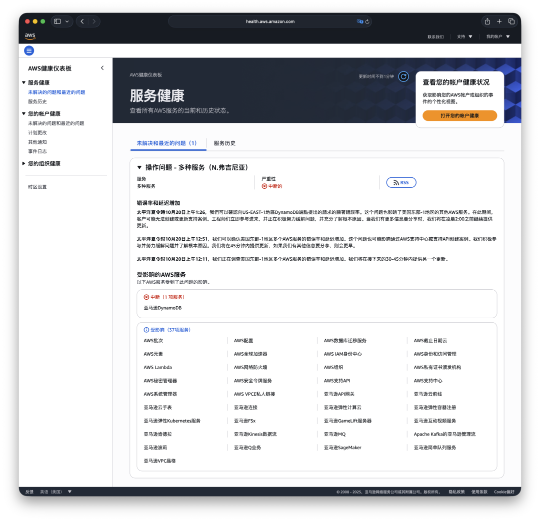 影响的范围仍在进一步蔓延,因为影响的服务包括 IAM 这类核心基础设施服务,此外位于美国东部(北弗吉尼亚)的 US-EAST-1 区域是 AWS 最大且最重要的区域,是 AWS的第一个区域与默认区域。受影响的服务数量从本文撰写之初的 17 项,已经蔓延到截止发稿时的37项。