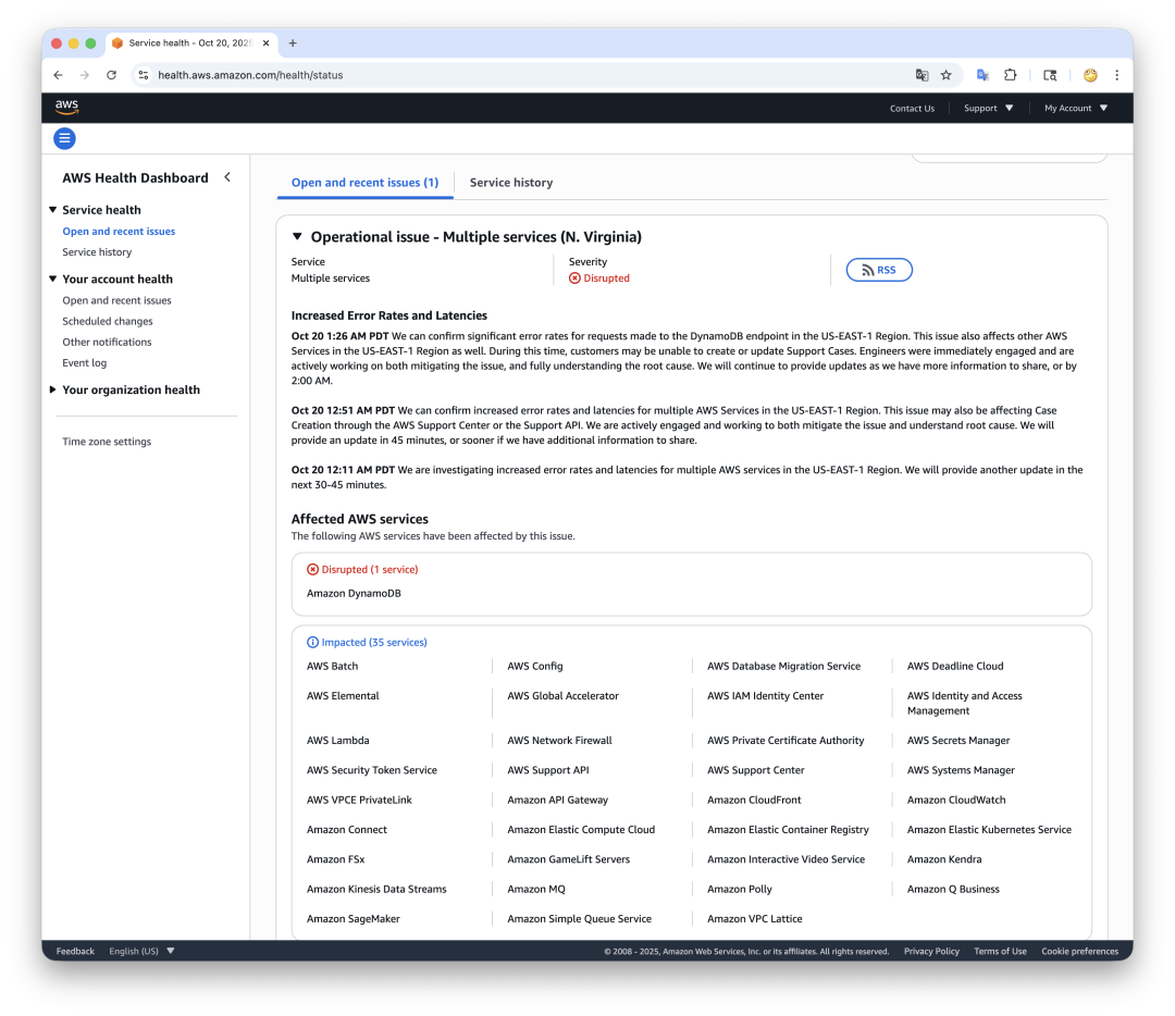 就是现在,AWS 状态页报告 US-EAST-1 可用区出现故障。37 项服务受到影响。DynamoDB 服务中断,根据亚马逊的服务健康页面,故障的根因是 DynamoDB 服务错误,进一步影响了 US-EAST-1 区域的其他服务。随即蔓延至整个互联网的多项服务,包括 Docker, Coinbase, Roblox,Snapchat 等,DownDetector 上一片红。