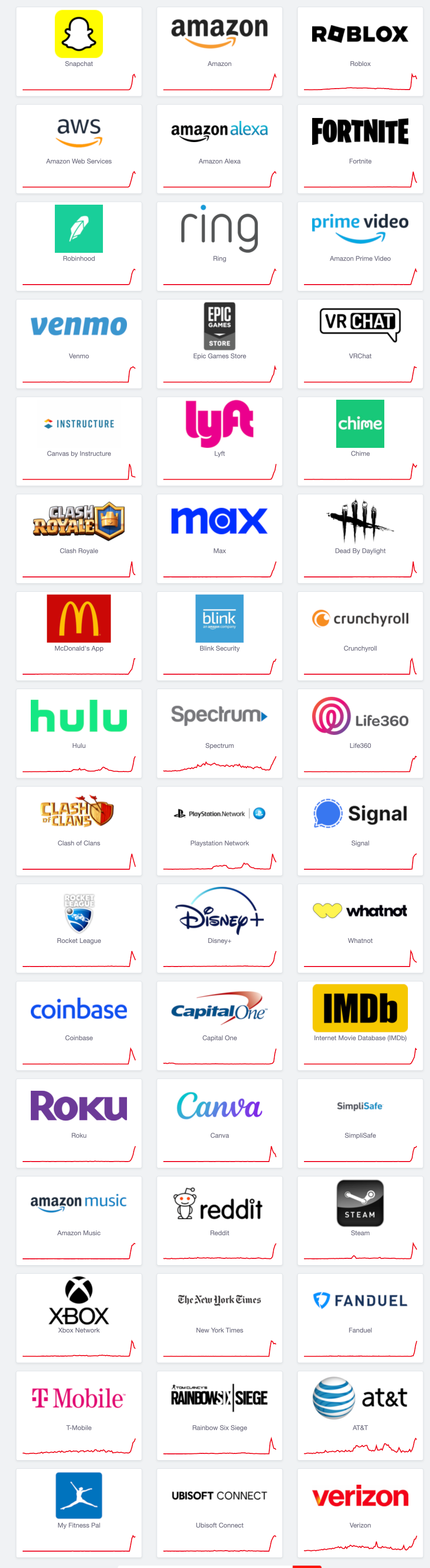 很多公司因为各种原因(默认区域,服务最全) 只部署在 AWS us-east-1 ,在此次故障中受到严重影响。根据 Down Detector 的报告,包括但不限于: