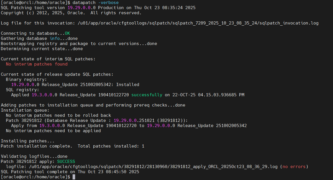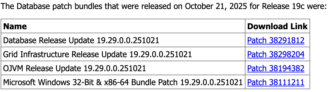 老样子,Oracle 在 10 月份发布第三个季度补丁,推迟一周,19C 最新 RU 补丁 19.29 如下: