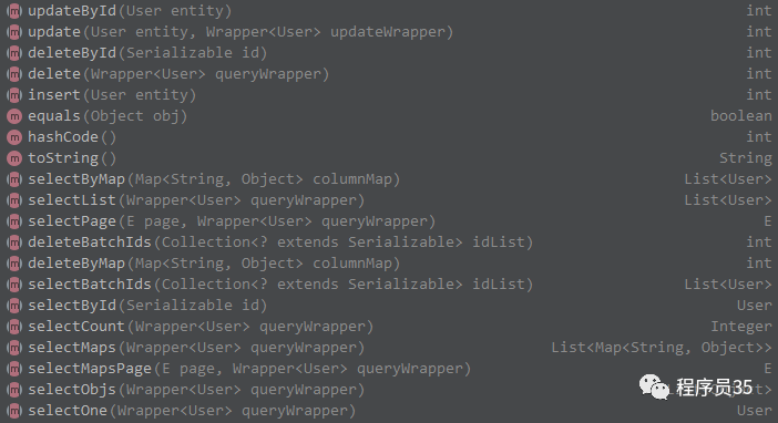 这里继承 Mybatis-Plus 中的 BaseMapper 接口,这样就自动拥有了其中的所有接口,不用写 XXXMapper.xml 文件,相关接口如下: