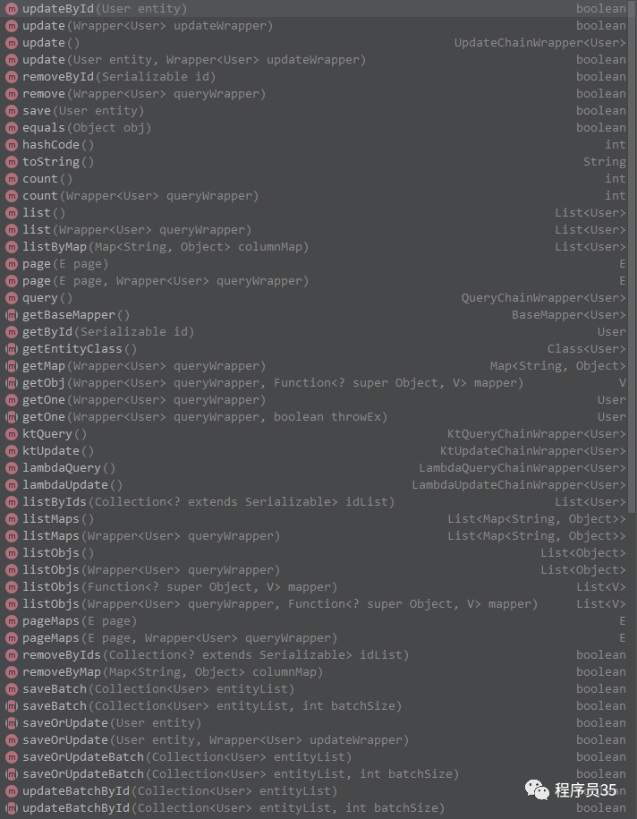 这里继承 Mybatis-Plus 中的 IService 接口,这样就自动拥有了其中的所有接口,相关接口如下: