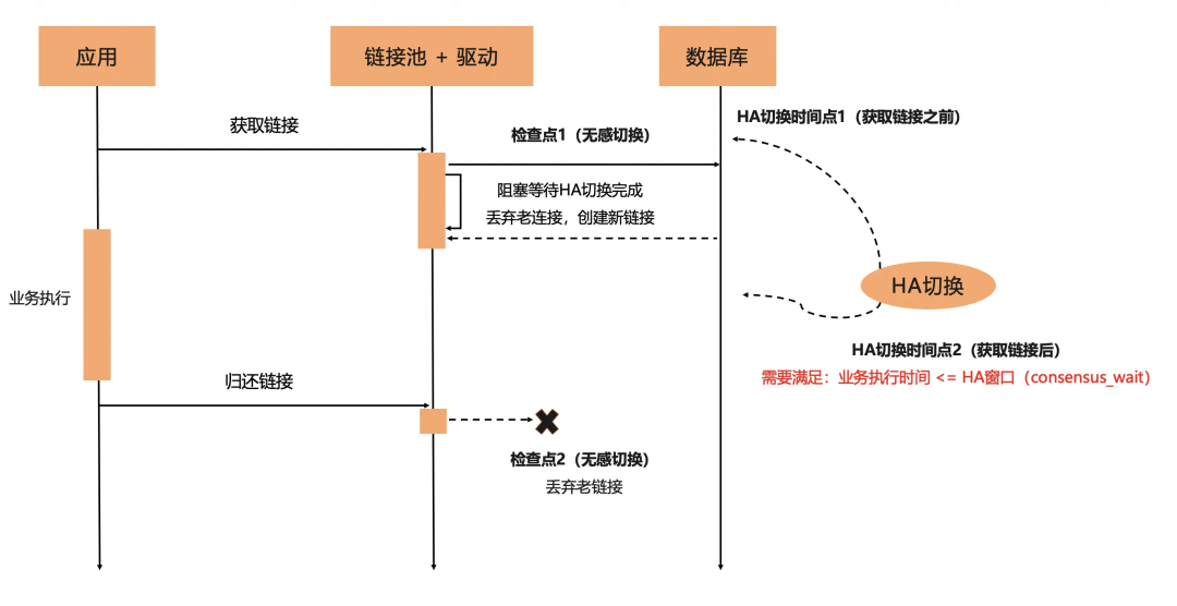 客户端驱动,新增两个无感切换的检查点(获取链接、归还链接),通过实时感知PolarDB-X标准版三节点集群状态,实现HA切换后链接的动态重建能力,仅增加了获取新连接时间,但不会导致已有连接上请求报错,实现计划切换时应用无感。 业务获取了数据库Connection链接,推荐使用标准try-with-resources实现的数据库操作,只要try块中的业务执行时间小于对应PolarDB-X设置的HA窗口(consensus_wait_millisecond_before_change_leader时间阈值,默认为1秒),就不会因为计划切换报错。而对于持有连接时长超出时间阈值的长事务,因为横跨切换流程,切换后会因为不能写入而报错。