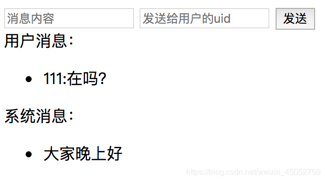 浏览器访问http://localhost:8080/index.html 开启两个页面,分别输入两个不同的uid,这里使用111,222 控制台: