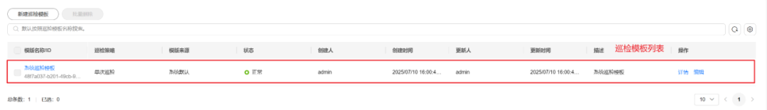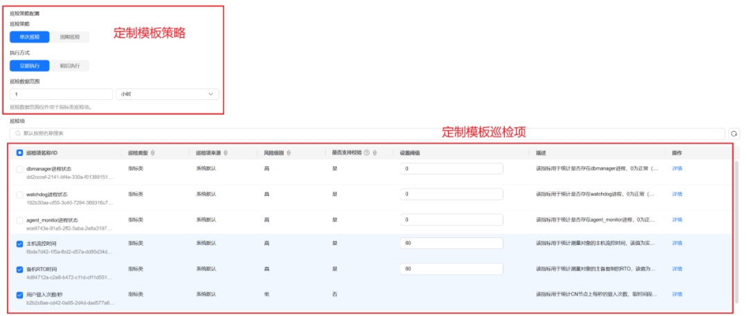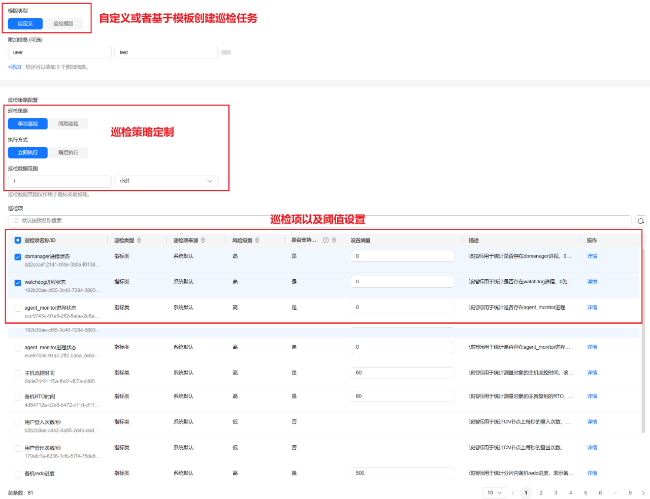 巡检模板自定义:运维人员可以通过系统自带的巡检模板快速创建巡检任务,也可以根据需要自行创建巡检模板,包括自定义附加信息、巡检执行策略、巡检项以及巡检项阈值等,并基于自定义的巡检模板创建巡检任务,提升巡检任务的创建效率。
