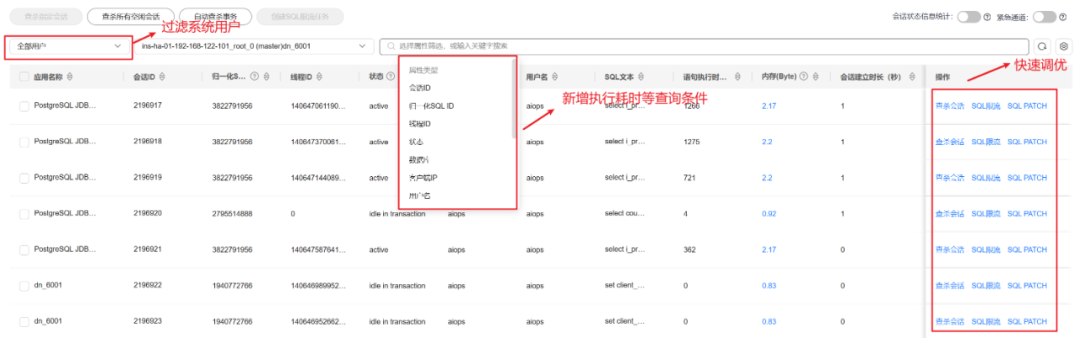 可以根据不同的查询条件定位不同类型的异常,如通过SQL执行时间列排查会话执行的慢SQL,通过内存列排查内存占用高的会话等。