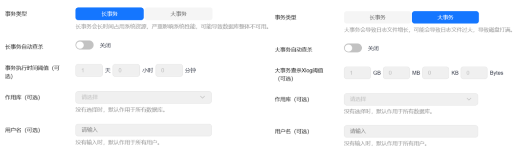 可以通过配置对长事务和大事务进行自动持续查杀,保障实例的稳定性。