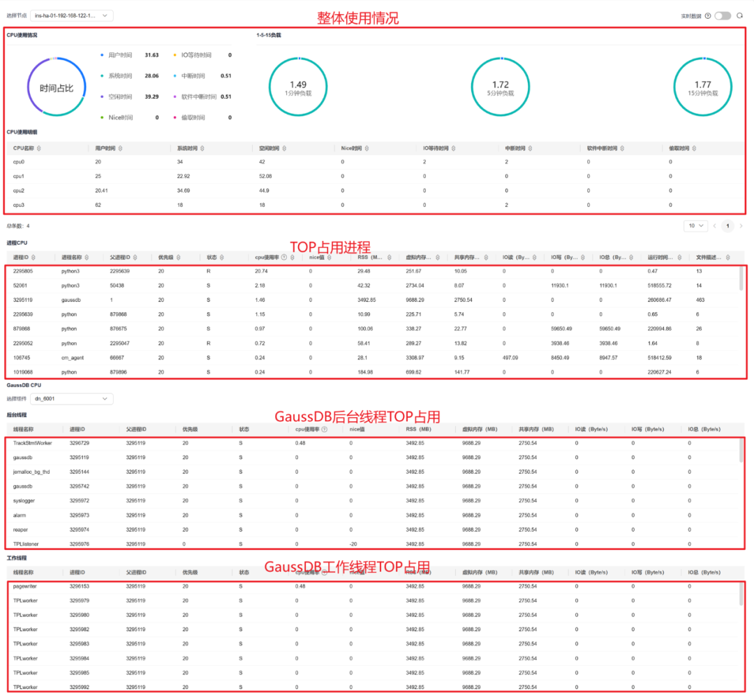 通过节点CPU分析查看节点整体CPU使用、TOP CPU进程占用,以及GaussDB进程TOP CPU占用的工作线程和后台线程,排查是否存在CPU异常占用的进程或者线程。