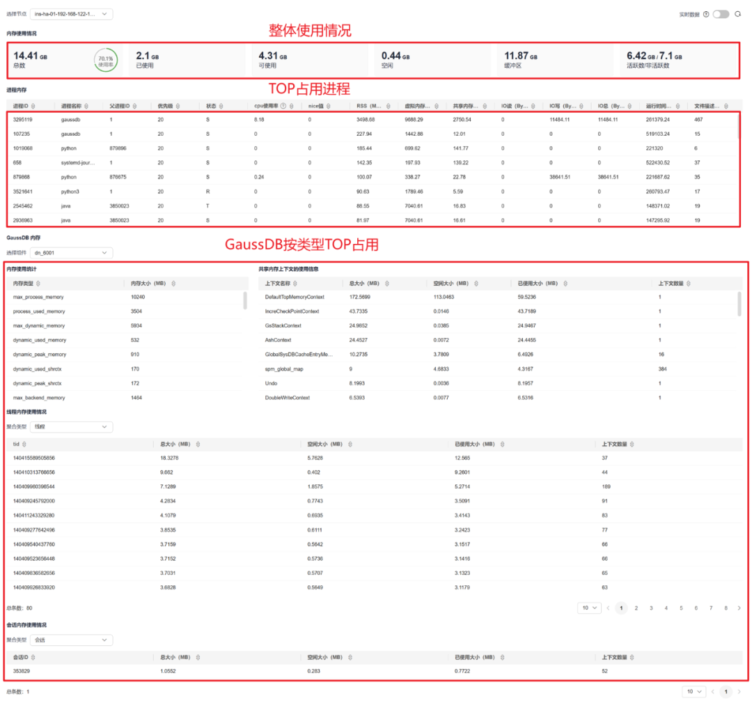 通过节点Mem分析查看节点整体Mem使用,TOP Mem占用进程,以及GaussDB进程不同上下文和线程Mem占用情况,排查是否存在Mem异常占用进程或者线程