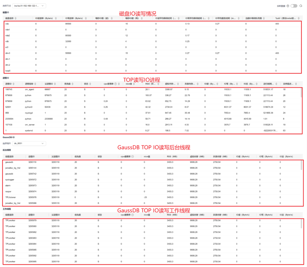 可以通过节点IO分析查看节点磁盘IO使用情况、TOP IO占用进程,以及GaussDB进程TOP IO占用的工作线程和后台线程,排查是否存在IO异常占用的进程或者线程。