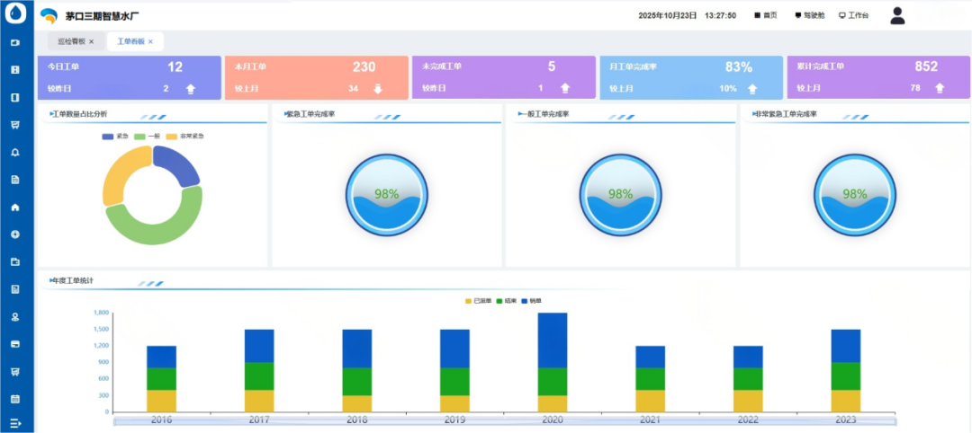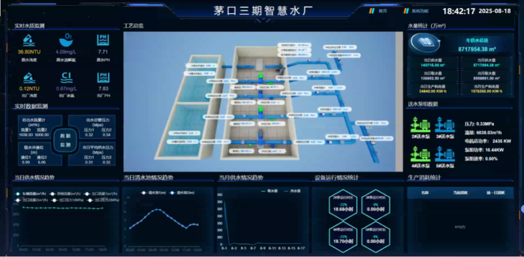 在服务质量层面,水质监测数据实时上传与可视化展示,保障了饮用水安全,市民用水满意度显著提升;智慧巡检与工单管理确保设备稳定运行,提高水厂供水可靠性,有效应对城市用水高峰需求。