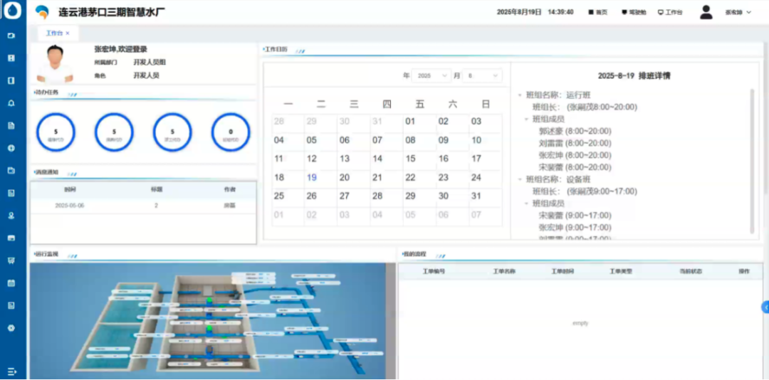 驾驶舱:作为水厂运营的“大脑”,整合展示水量、水质、能耗、工单等核心数据,搭配三维可视化界面,实时呈现水厂运行状态,让管理人员快速掌握全局。