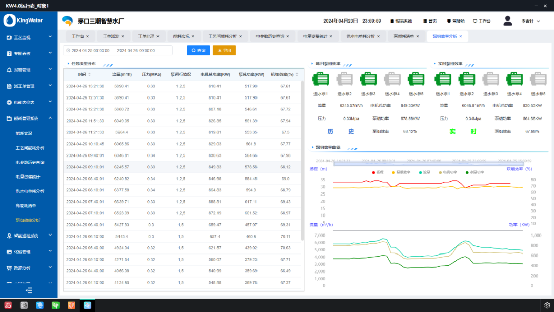 能耗管理:针对水厂高能耗特点,提供能耗同比环比分析、工艺间能耗对比、泵组效率评估等功能,精准定位高能耗环节,为节能改造提供数据支撑,降低运营成本。