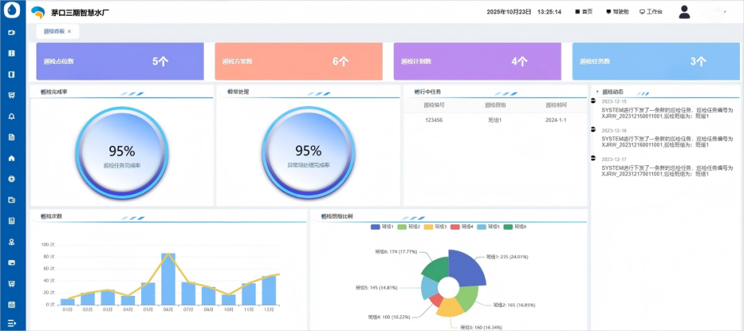 智慧巡检:支持视频自动巡检与人工巡检结合,通过图像识别技术,自动检测地面积水、螺丝松动、设备漏油等异常,生成巡检报告并触发报警;同时可制定巡检计划、下发临时指令,实时追踪任务完成率,班组长线上复核,确保巡检无遗漏。