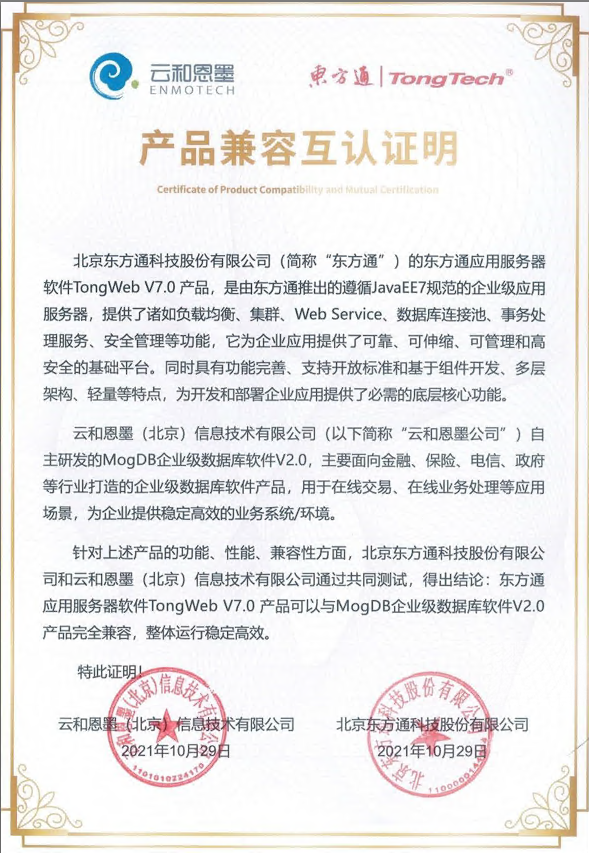 基于此次合作,云和恩墨旗下的企业级数据库MogDB V2.0与东方通TongWeb V7.0顺利完成产品兼容互认证工作。经过相关部门严格测试,双方产品完全兼容,在功能、性能及兼容性方面表现良好,整体运行稳定高效。