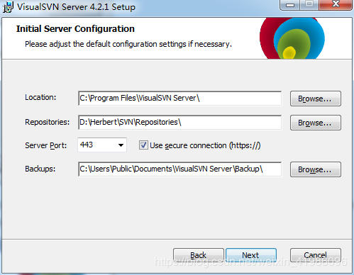 Location是指VisualSVN Server的安装目录Repositorys是指定你的版本库目录Server Port指定一个端口Use secure connection勾上表示使用安全连接Use Subversion authentication 表示使用Subversion自己的用户认证.