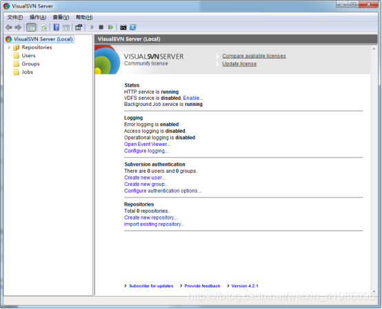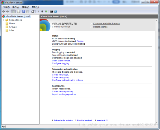 安装完成后,启动VisualSVN Server Manager,如图: