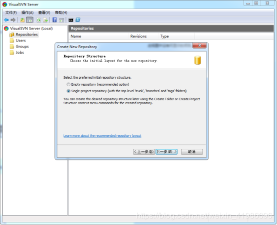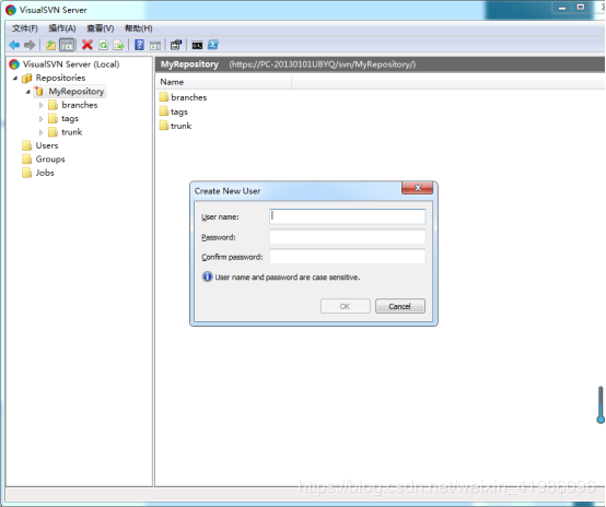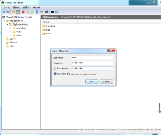 输入版本库名称,勾上Create default structure复选框(推荐这么做).点击OK,版本库就创建好了,版本库中会默认建立trunk,branches,tags三个文件夹