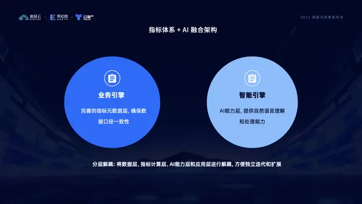 - 业务引擎:构建完善的指标元数据层,如同 “数据字典”,确保无论通过报表、BI 工具还是 AI 问答,核心指标定义唯一、一致、可信,解决企业数据口径不一的痛点。