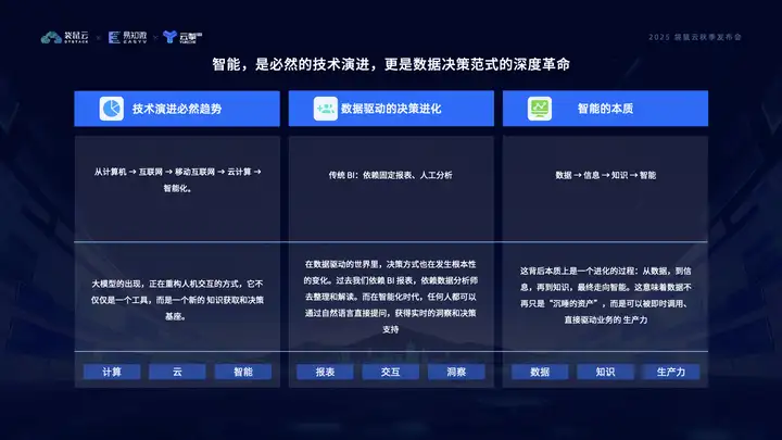随着大数据与人工智能的深入发展,人机交互方式逐渐被重塑。在数据驱动的大背景下,企业决策方式也发生了根本性转变。传统的 BI 分析依赖固定报表,需要人工整理和解读。但在智能化时代,任何人都可以用自然语言直接提问,获得系统提供的实时洞察和决策支持。数据开始主动地支撑人,帮助我们更好地理解世界、做出决策。