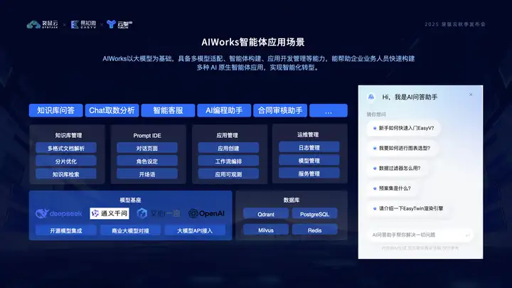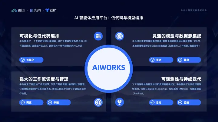 - AIWorks 智能体开发平台层:作为核心平台,提供从数据接入到应用发布的全流程工具链。其中,工作流模块支持复杂业务逻辑自动化、智能化实现,可调用外部工具与内部系统;RAG 模块解决大模型 “幻觉” 与知识滞后问题,提升问答准确性;模型管理与应用发布模块保障模型全生命周期管理与快速落地。