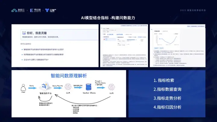 - 智能引擎:基于 AIWorks 平台构建,负责将用户自然语言问题进行语义理解、意图识别,转化为结构化指标元数据查询请求,提升用户与数据交互效率。
