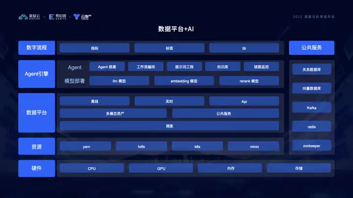 袋鼠云以 “数据平台 + AI” 为核心构建技术架构,围绕数据、模型、智能体三大要素,通过双引擎驱动,平衡业务严谨性与 AI 灵活性。