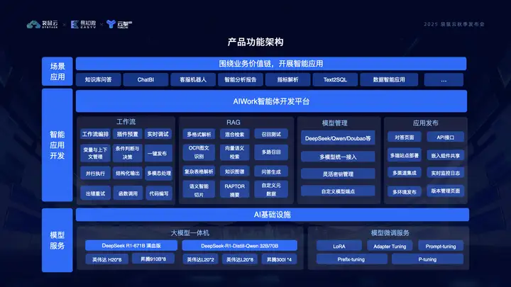 - AI 基础设施层:集成 DeepSeek、Qwen 等主流大模型,搭配英伟达 H20、昇腾 910B 等不同硬件,可根据业务场景复杂度灵活选择合适模型与算力,为 AI 应用提供 “最强大脑” 支持。