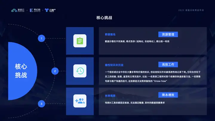与此同时,在企业真正落地智能化的过程中,常常也面临着一些非常现实的核心挑战,造成数据分散难以统一利用、人员流动难以复制经验、业务变化难以实时响应。