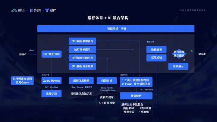 - Query 处理与意图识别:借助 CoT(思维链)、Few-Shot 等技术,改写优化用户原始 Query,同时识别用户需求类型,如指标查询、展示、归因分析或信息检索。