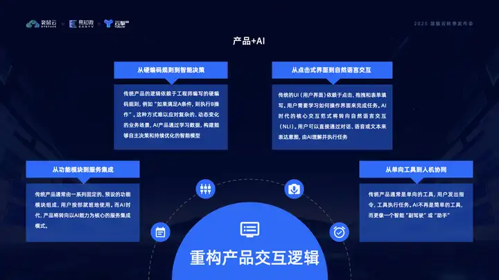 面对企业智能化落地的各种挑战,AI 为产品突破限制提供了新思路,实现了从底层逻辑到交互方式的全面重构,让产品从“工具”变成“伙伴”,从“操作”变成“协作”。